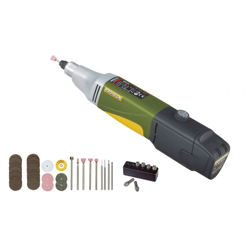 Pour percer, fraiser, meuler, poncer, nettoyer, couper, graver et signer. Axe en acier rectifié monté sur double roulement à billes et 6 pinces de serrage MICROMOT à triple fente (1 - 1,5 - 2 - 2,4 - 3 et 3,2 mm) pour une précision de concentricité élevée. Ni de broutage ni de battement des outils. Système MICROMOT avec collet de 20 mm pour fixation sur les supports de perçage et supports horizontaux. Avec 34 accessoires. La livraison comprend la batterie Li-Ion Li/A2 (10,8 V) et le chargeur de batterie rapide LG/A. La meuleuse-perceuse industrielle IBS/A est TOP et sa performance est comparable à nos appareils connectés au réseau. Lorsque vous travaillez à l'extérieur ou si vous devez utiliser une rallonge, le travail sans fil présente de grands avantages. 10,8 V, 2,6 Ah; 7.000 - 23.000 U/min; longueur: 270 mm; poids 700 g